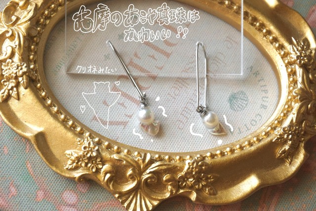 サージカルステンレス素材のアレルギー対応ピアス 手足があるような、クリオネみたいな形のアコヤ真珠です! 私には理想的な可愛いカタチ。 真珠の穴あけは難しく、なかなか思い通りにはいかなかったけれど、専用の機械を使って自分で穴を開けました。 少しでも丸くなかったり、傷や汚れがあると どんなに手間暇かけた真珠でも価値が下がります。 生産者さんは、どんな気持ちなんだろう。 こんなに可愛いのにね。 世界の常識は簡単に変わるから いつか、尻尾が広がれば広がるほど 真珠の価値は高いってなるかもしれないね。