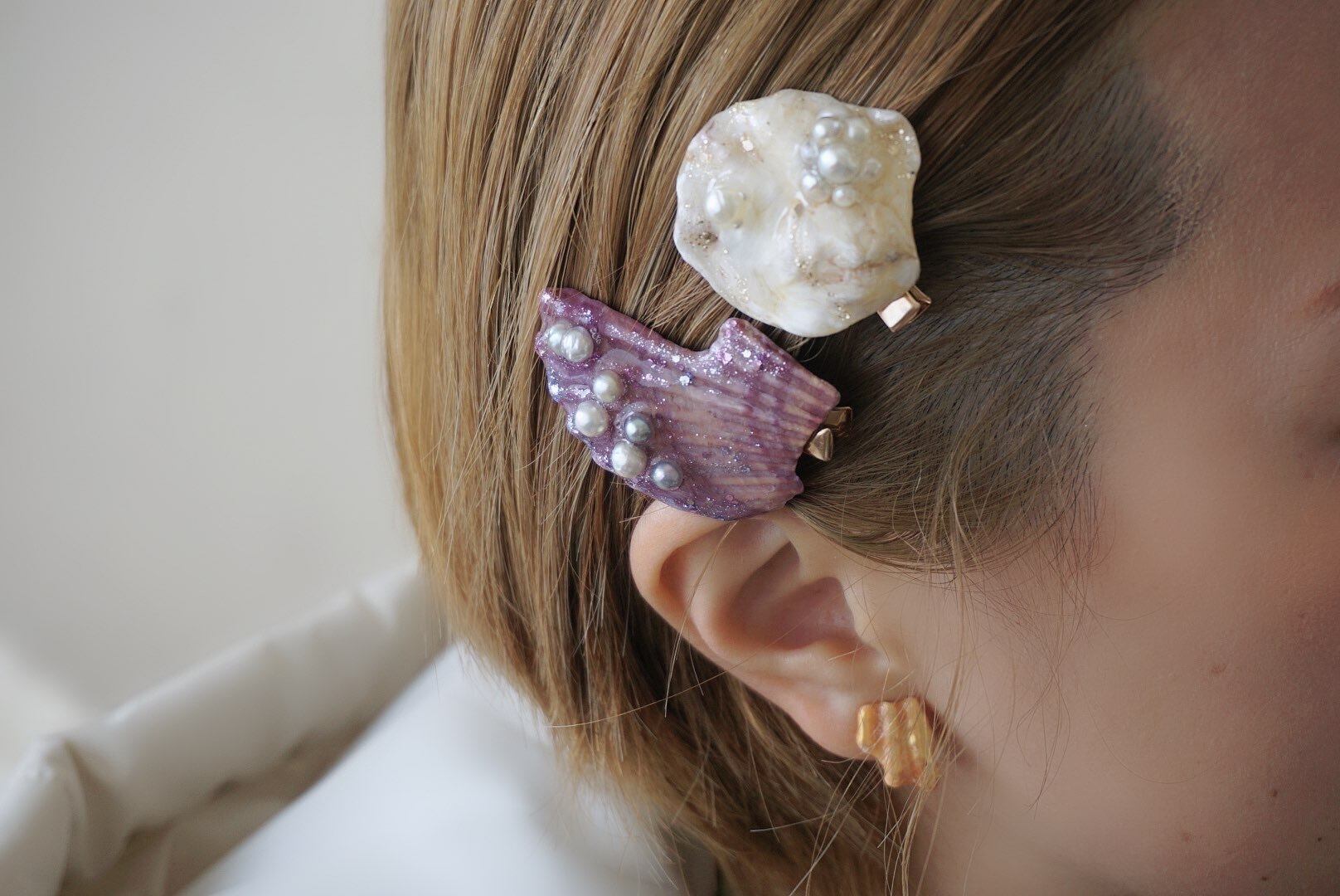 カラフルでかわいいバタ貝の珍しさ⭐︎⭐︎⭐︎のヘアクリップです。画像4枚目以降からは、貝殻ヘアクリップの着用イメージや、『こんな使い方も楽しめまっせ』という使い方イメージの写真となっております。
