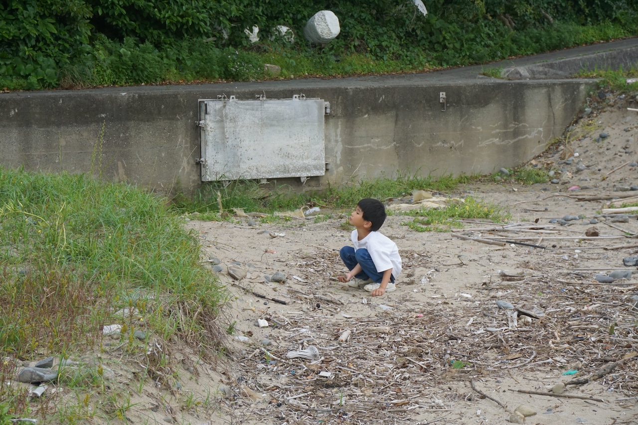 一緒にシーグラスを集め、こどもたちは流木で家を作り、私は撮影作業をするなどして過ごしてます。こんな環境で作って販売しているモノでございます。