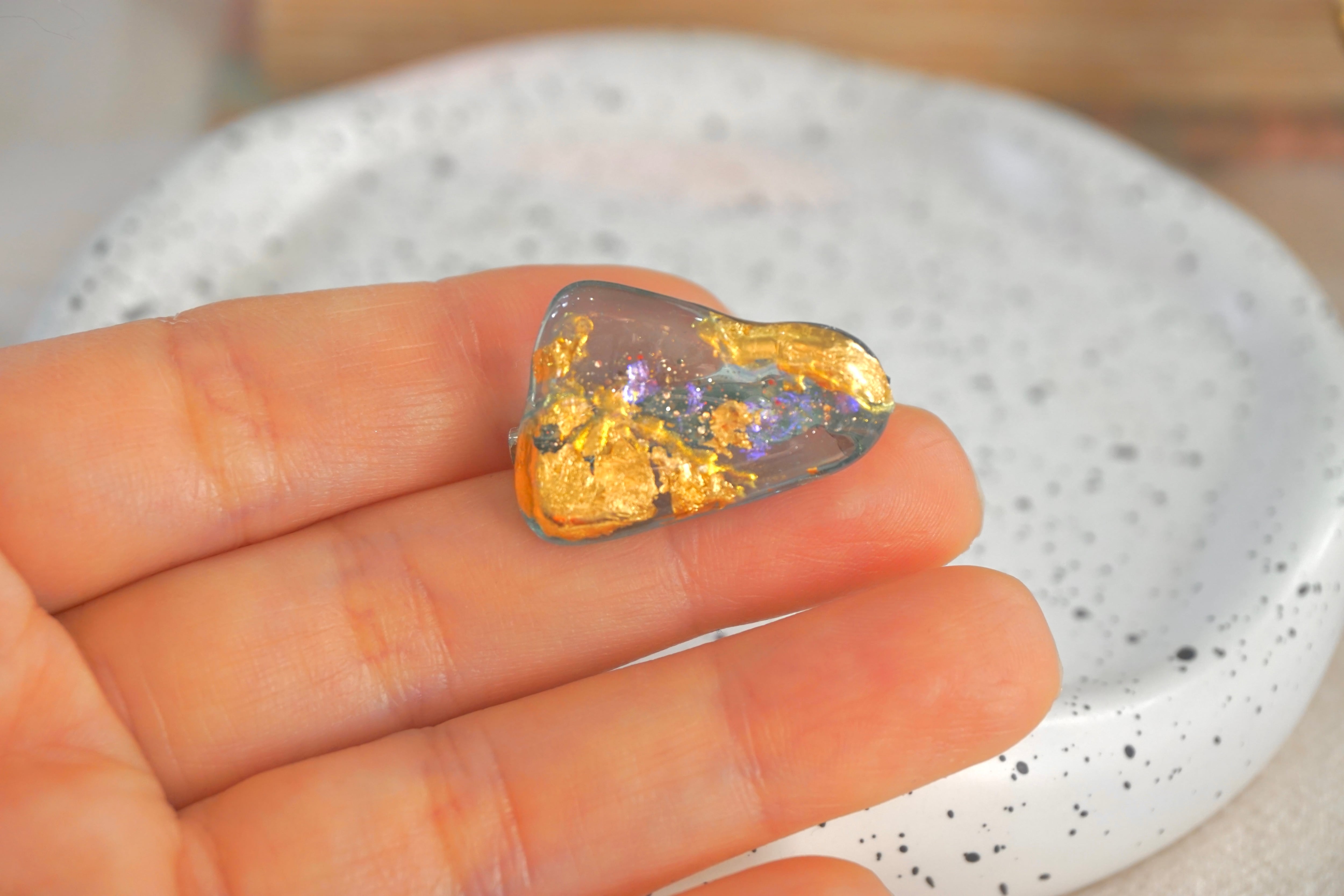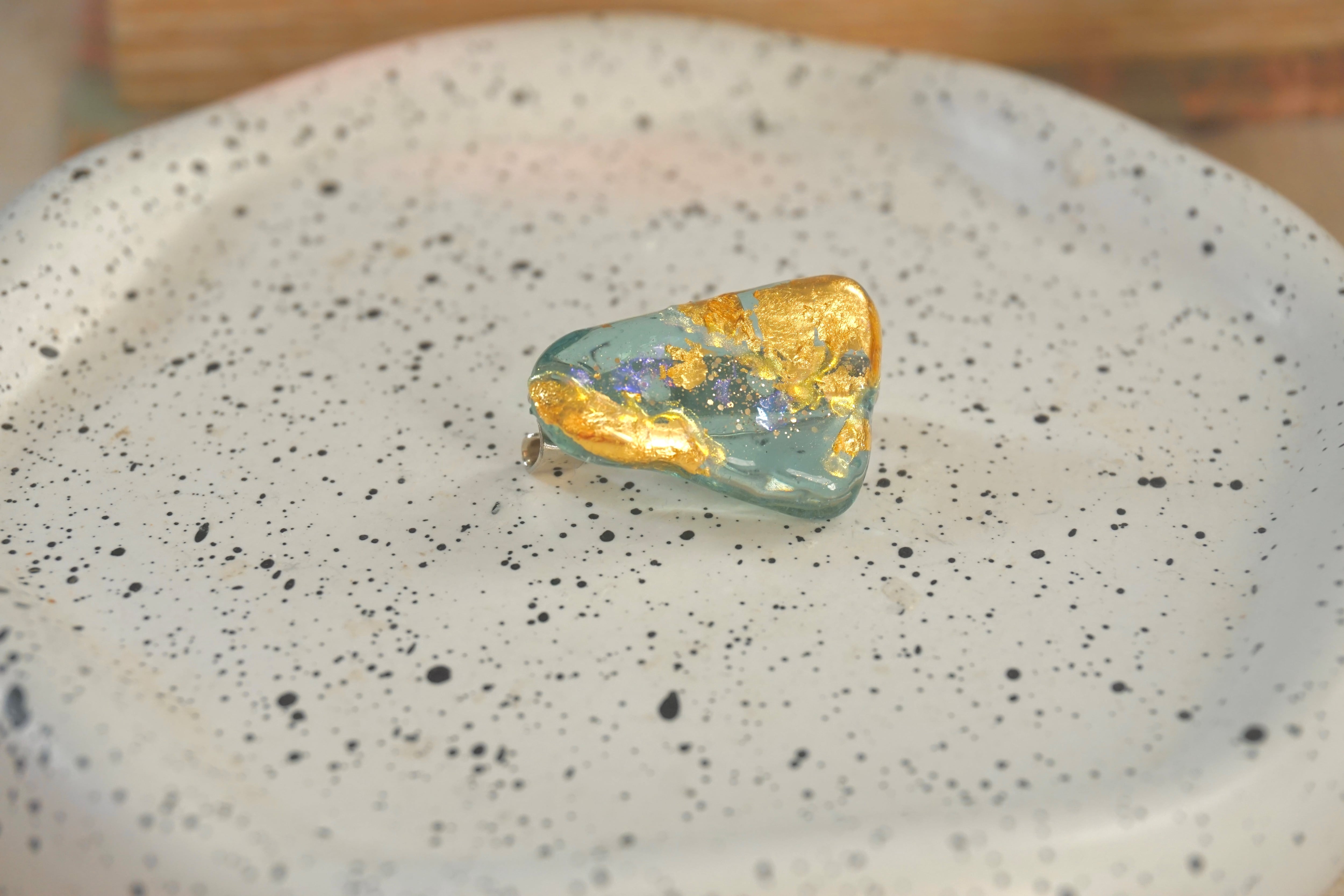 大王町船越にあります榊浜(さかきのはま)にて拾い集めたシーグラスを、船越神社にて祓い清めていただいき作った『大吉ブローチ』