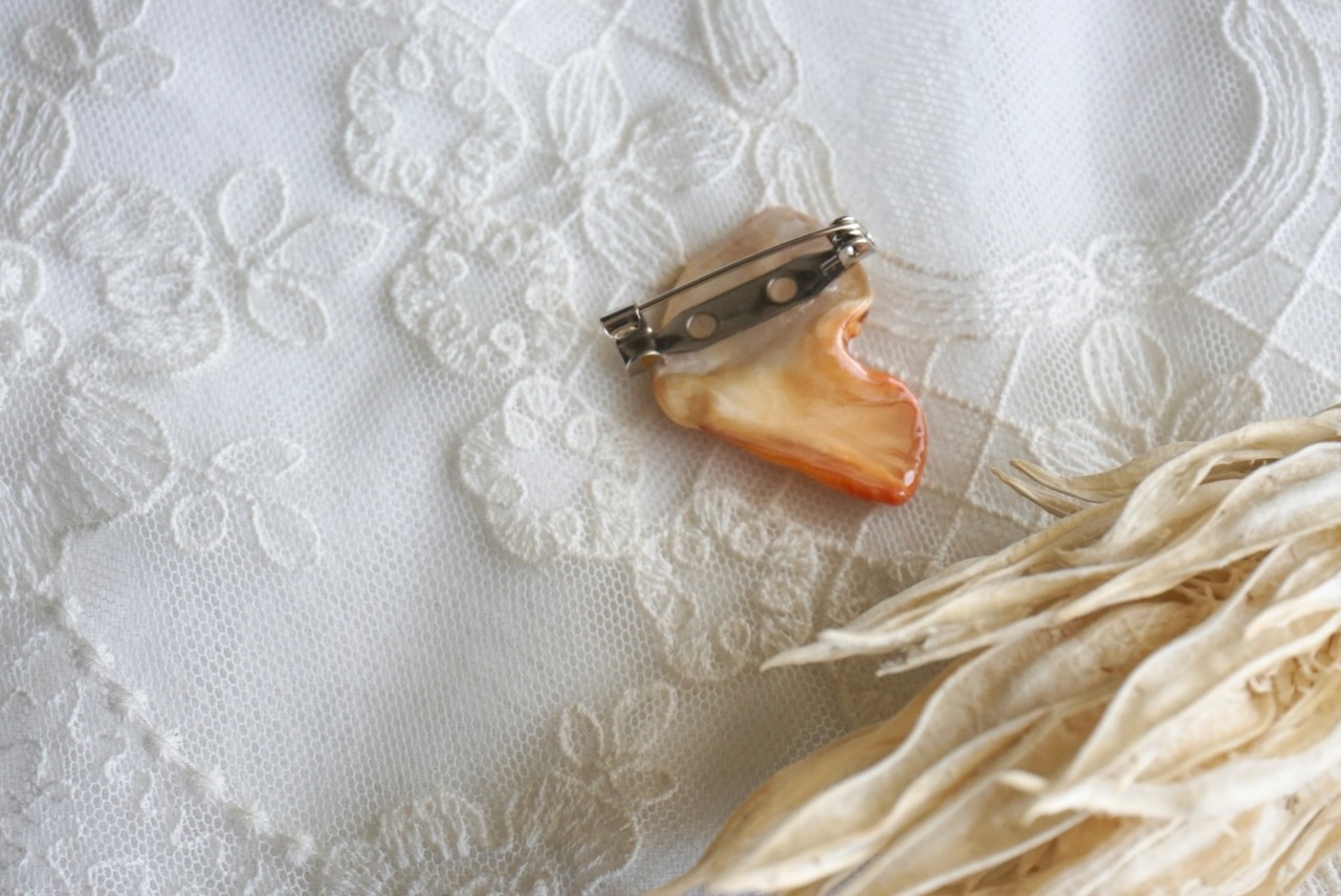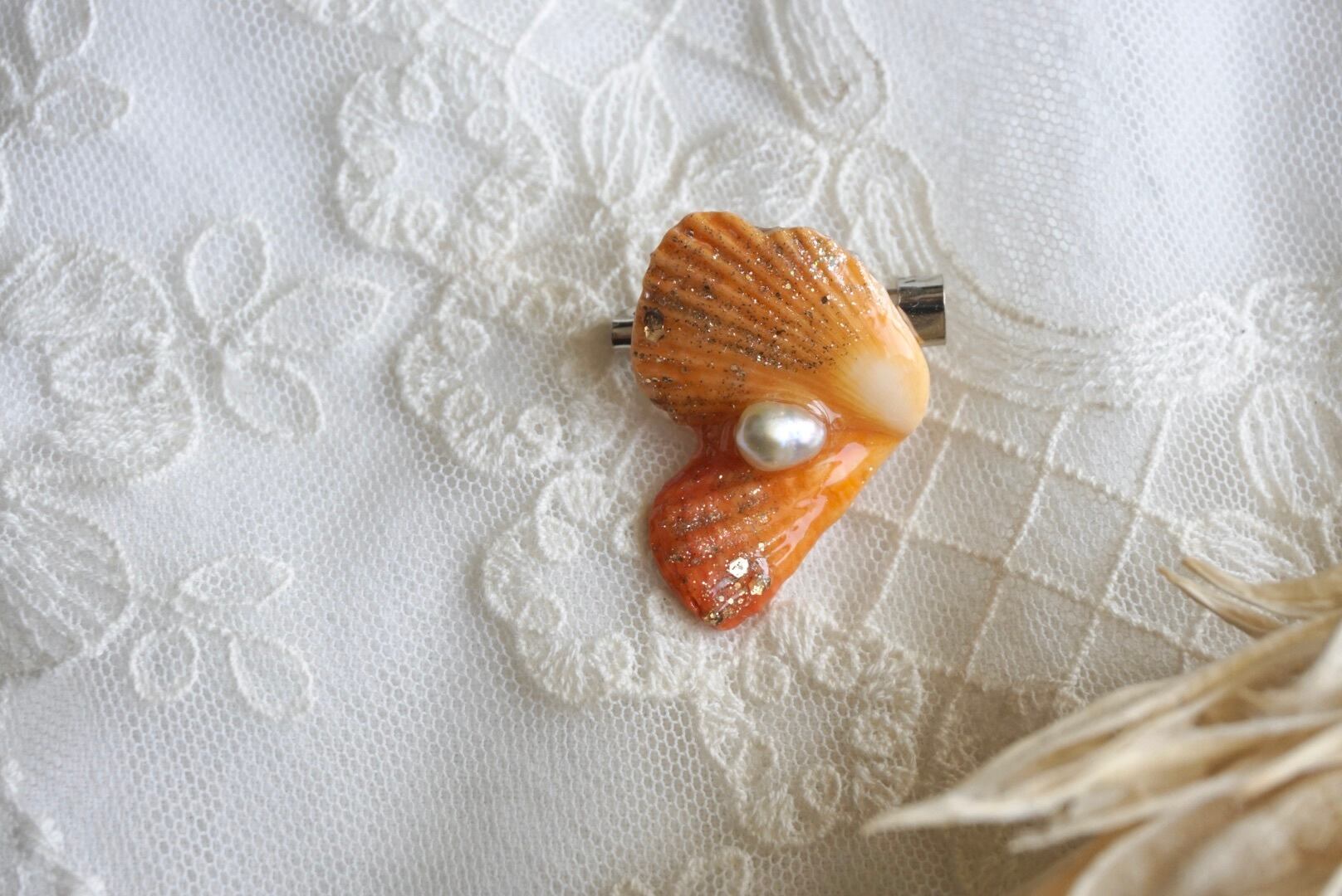 大王町船越にあります榊浜(さかきのはま)にて拾い集めた貝殻を、船越神社にて祓い清めていただいき作った『大吉ブローチ』