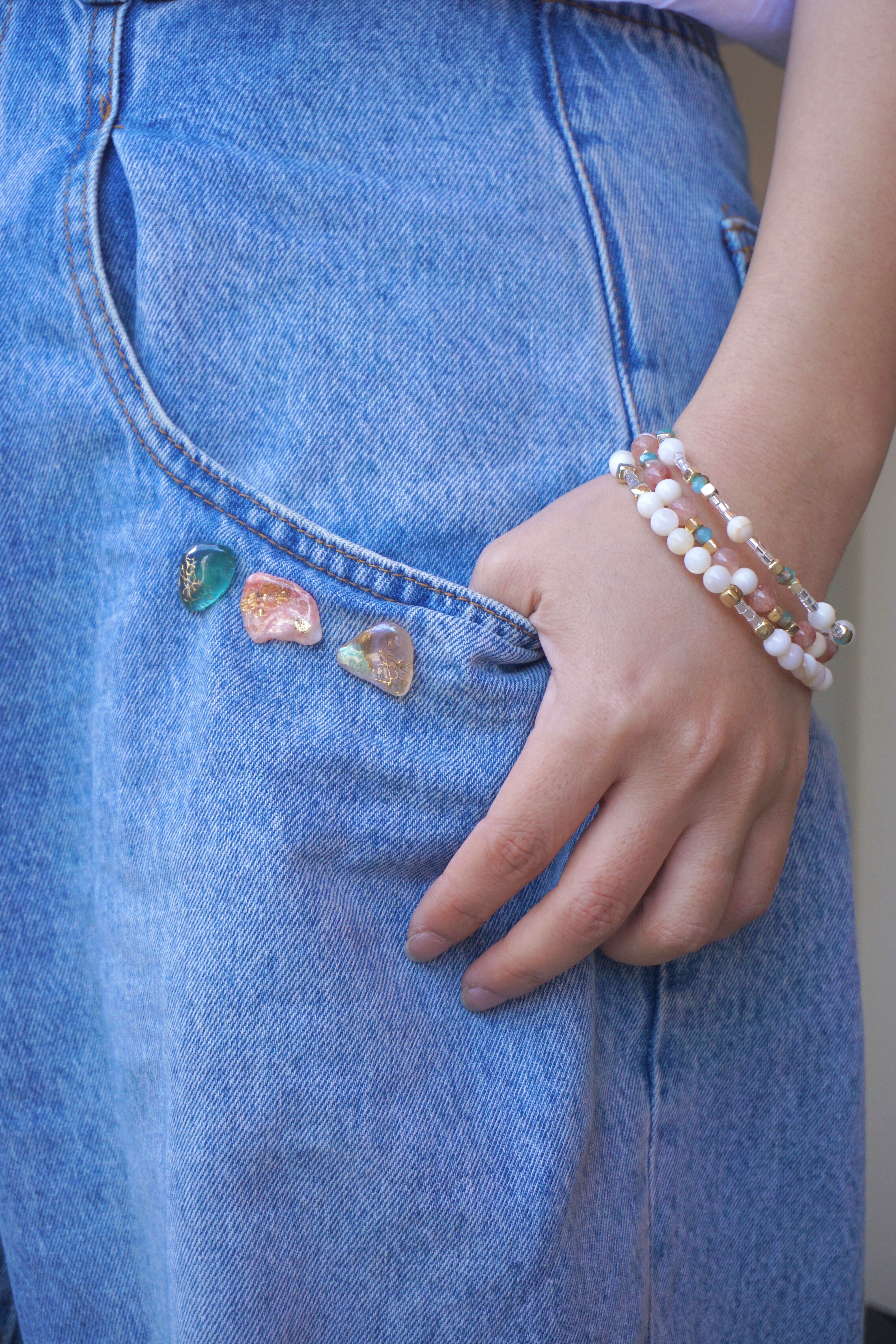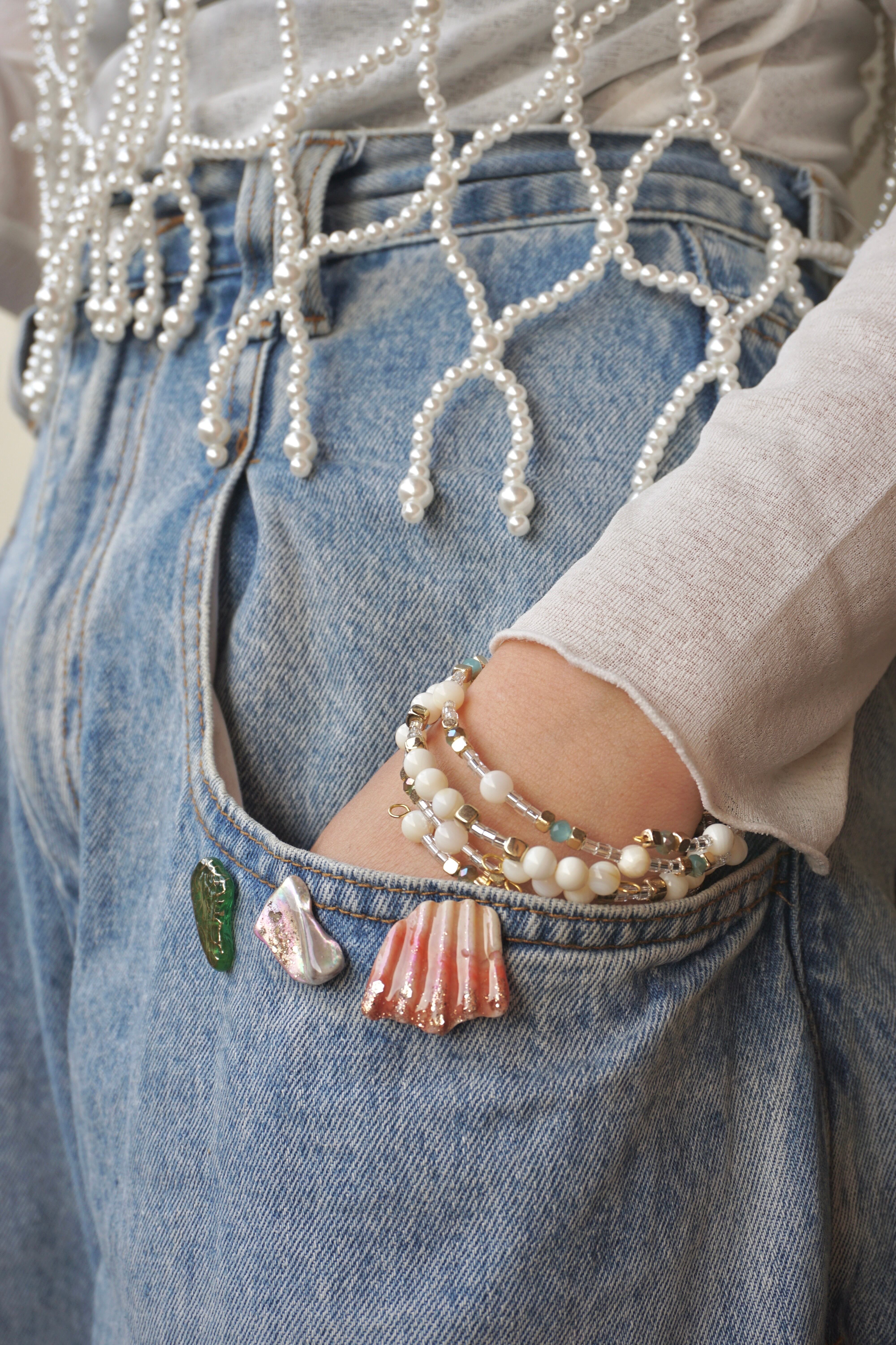 デニムのポケット、麦わら帽子、トートバッグなどに着けて楽しむことができます。