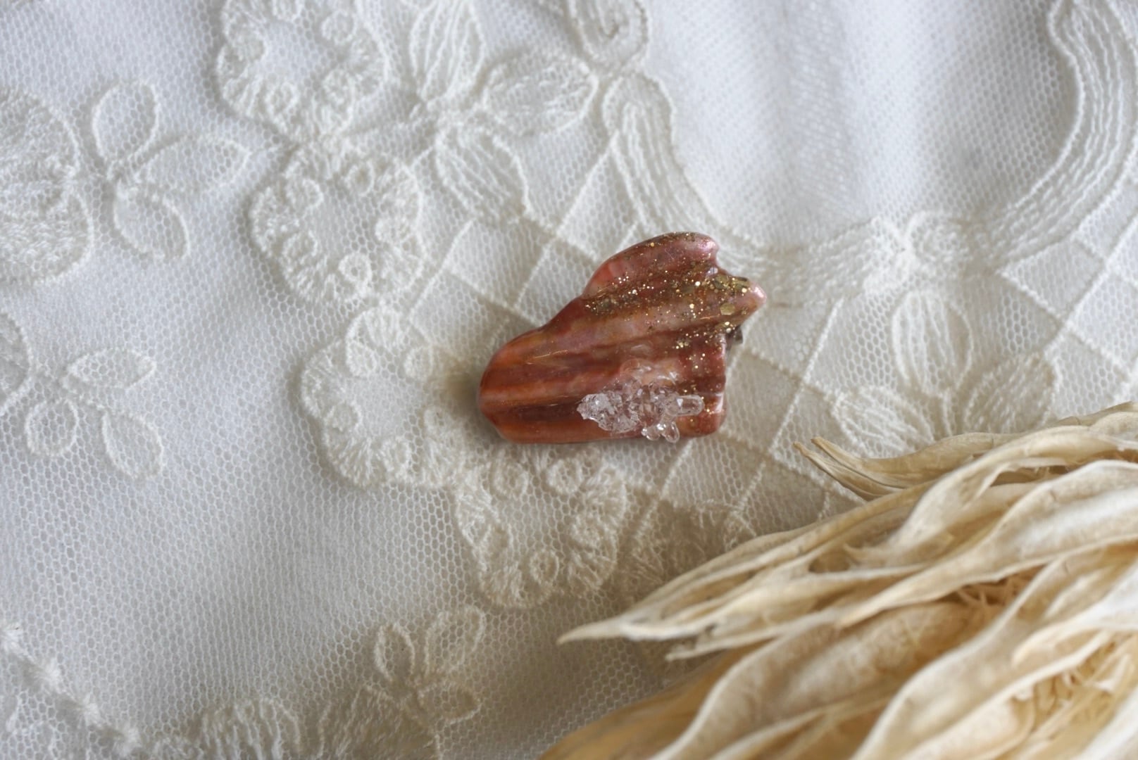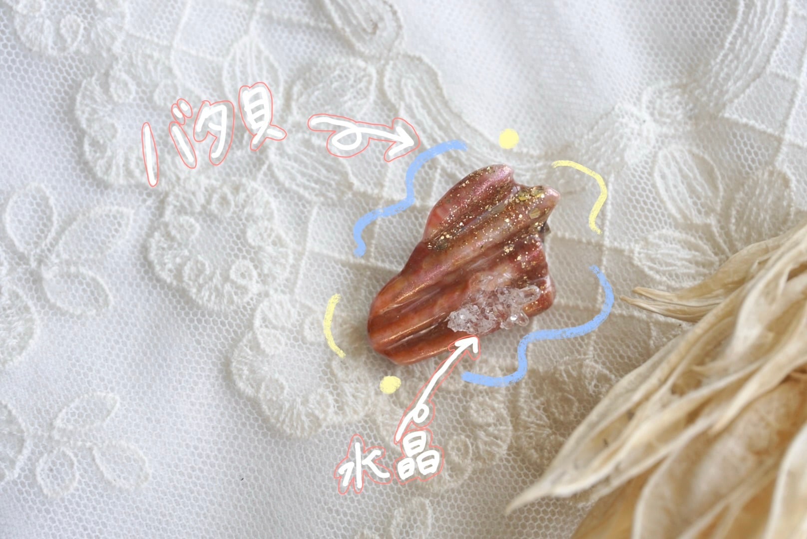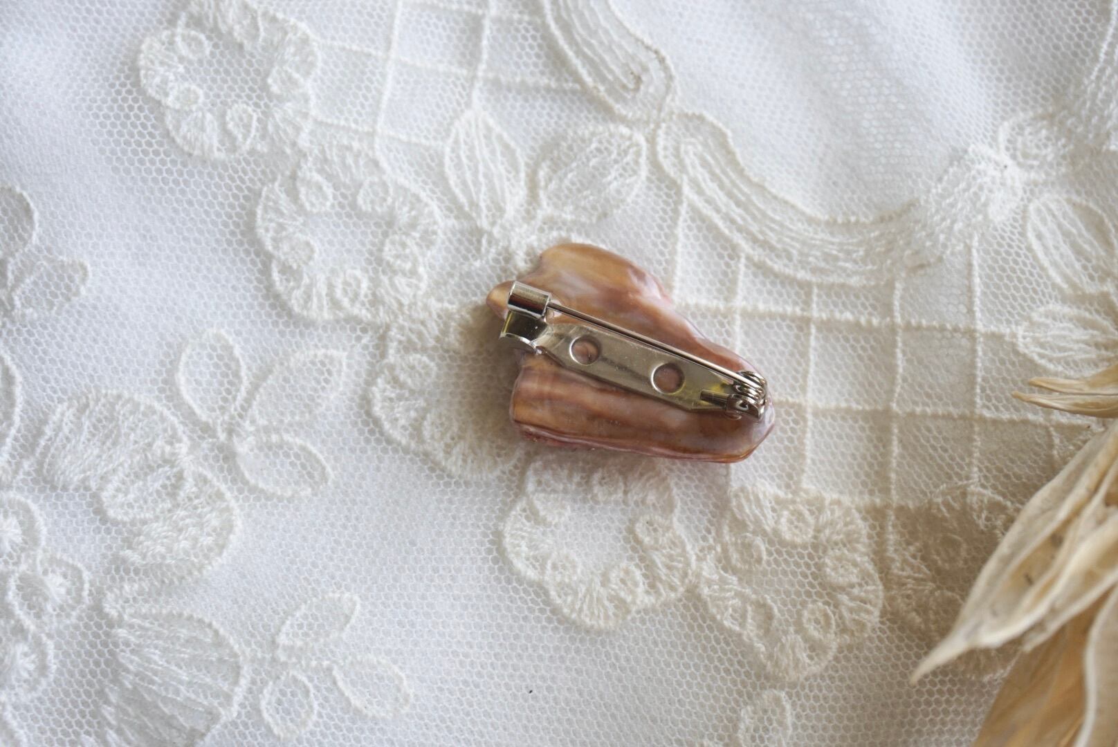 大王町船越にあります榊浜(さかきのはま)にて拾い集めた貝殻を、船越神社にて祓い清めていただいき作った『大吉ブローチ』