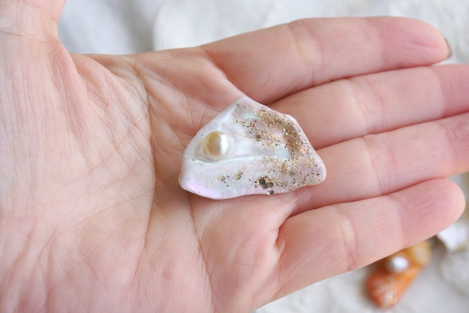 大王町船越にあります榊浜(さかきのはま)にて拾い集めた貝殻を、船越神社にて祓い清めていただいき作った『大吉ブローチ』
