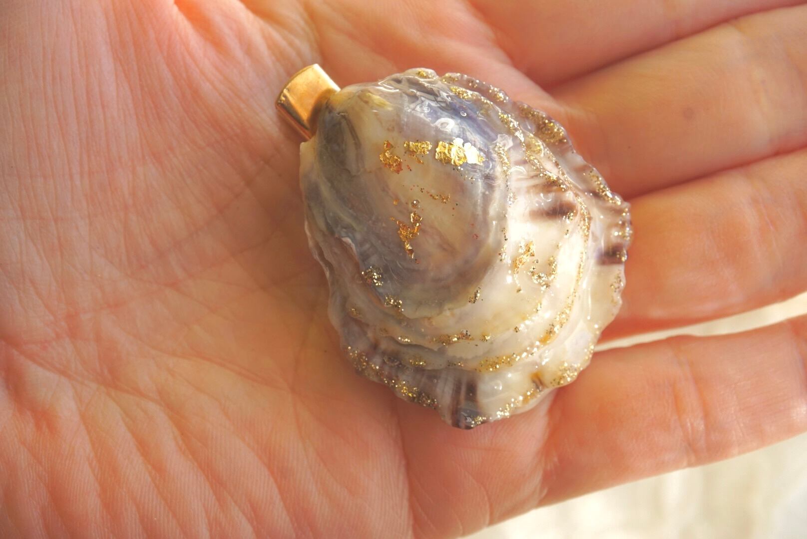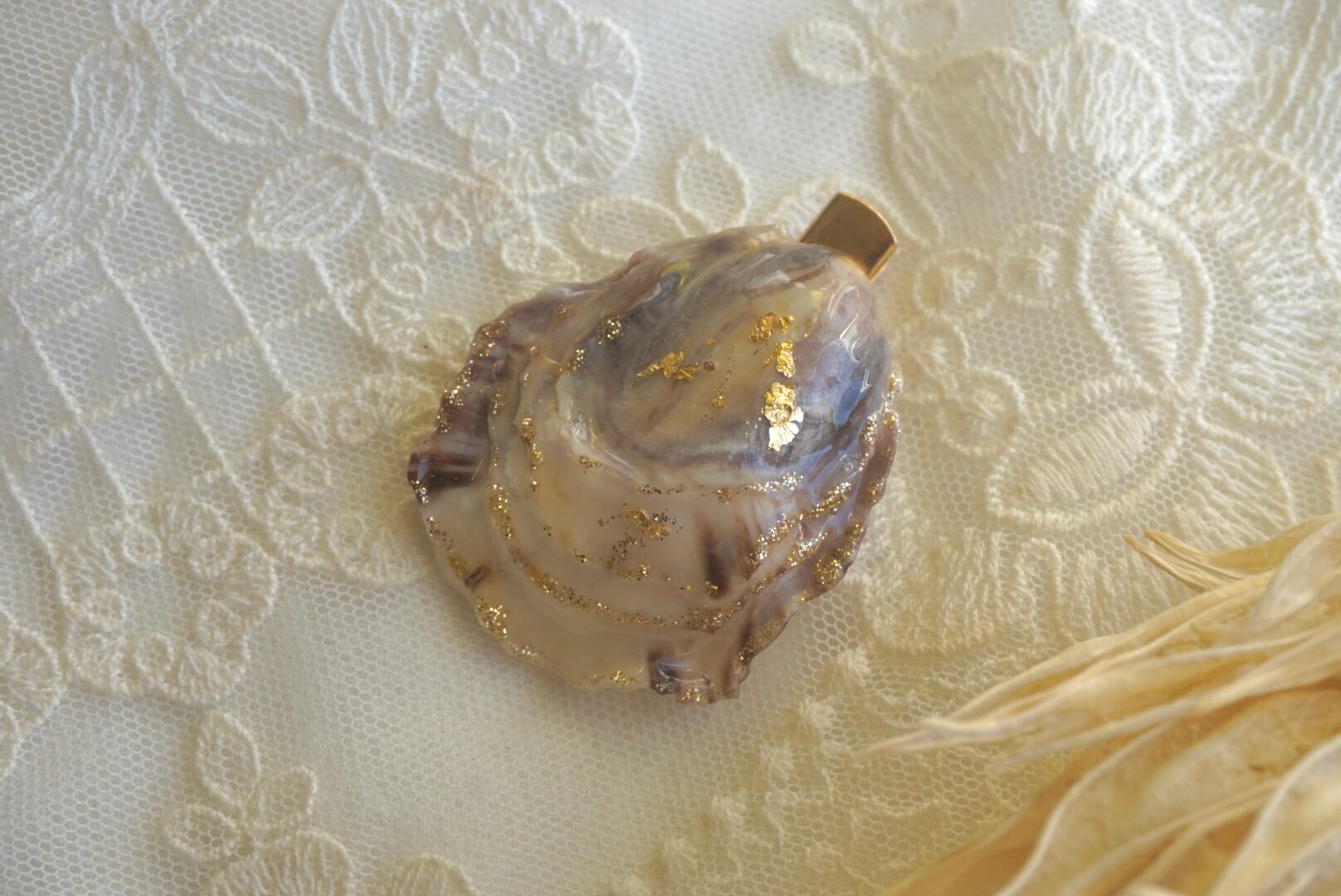 大王町船越にあります榊浜(さかきのはま)にて拾い集めた貝殻を、船越神社にて祓い清めていただいき作った『大吉ブローチ』